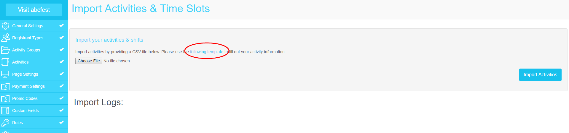 If some of your activities or time slots are not entered properly on the spreadsheet, the system will generate a list of activities skipped during the import and the reason why they were skipped under Import Logs.
