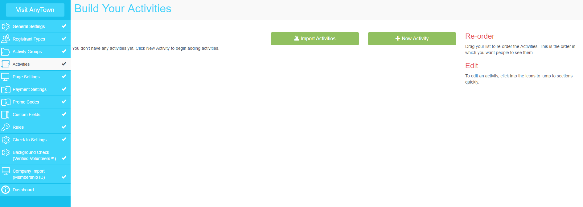 Before building your activities, make certain you previously added registrant types and activity groups.