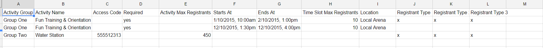 - Activity Name: Add the name of your activity in this column. If your activity has multiple times slots, you will need to repeat the activity group and activity name for each time slot.