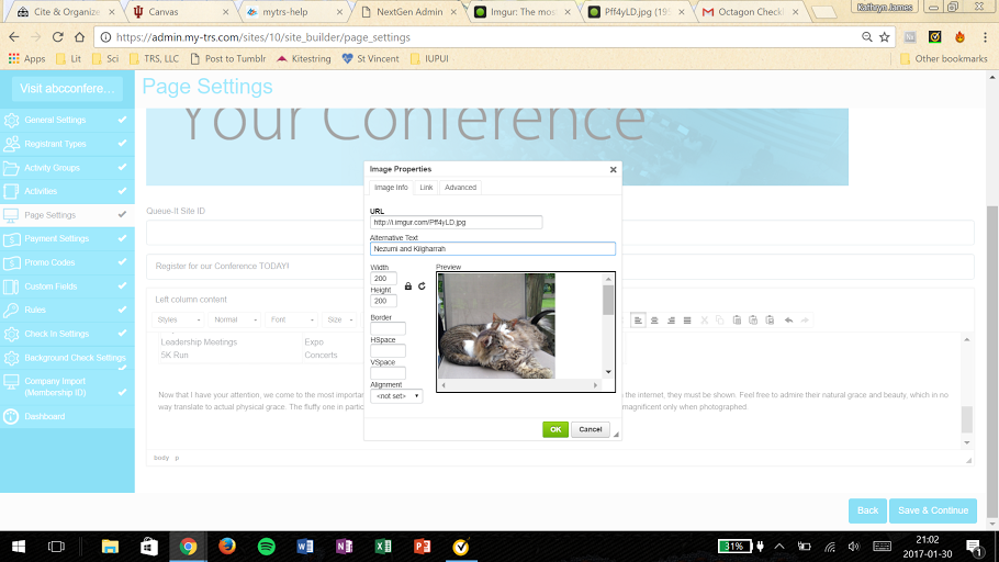That address copied from Imgur will go into the text box titled "URL". The text box below, "Alternative text," is an optional field that will show text when you hover over the image with your mouse. When I paste this picture to the landing page, it will be located where my cursor was last. In this example, my cursor is at the bottom of the page, a paragraph below my last sentence. See the result below.