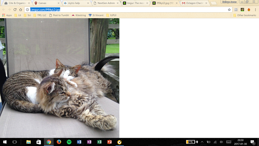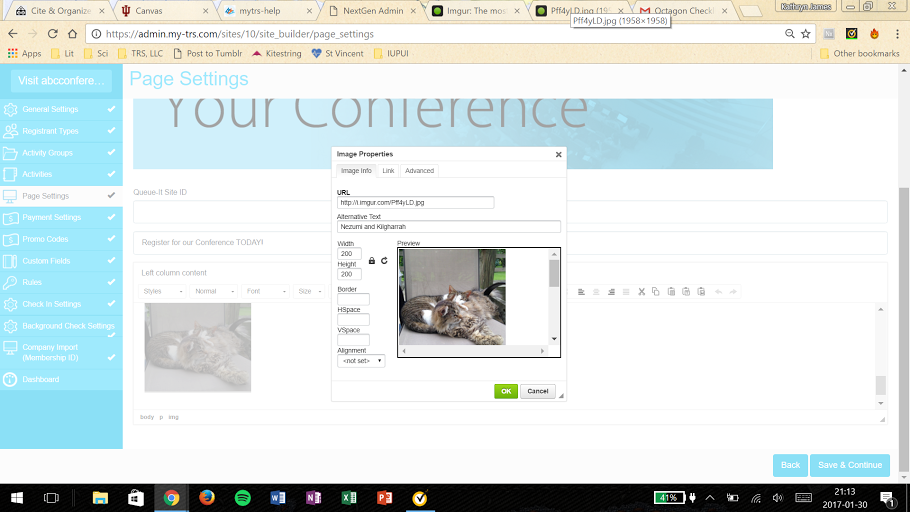 This is the physical, public location of your photo. Notice the address: It is no longer on imgur.com, but on i.imgur.com which is the public file. It also ends in a picture format, such as .png or .jpg. Now copy the address, which in the case of the photo of my cats is http://i.imgur.com/Pff4yLD.jpg . When I go into myTRS to the front page of my site, this is the address that I use to upload my file, as shown below.